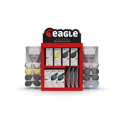 Expositor sobremesa para 32 gafas de cartón llamativo y compacto con los 8 modelos de la series Spark & Edge con la nueva normativa EN ISO 16321-1:2022 para gafas de protección laboral que cubren el 80 % de la demanda habitual en gafas de seguridad.