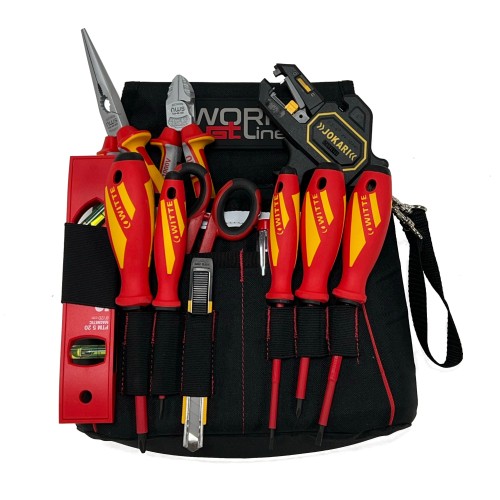 La cartuchera para electricista de GT Line es una solución práctica y profesional para técnicos que necesitan movilidad, rapidez de acceso y herramientas esenciales al alcance de la mano. Viene completamente equipada con herramientas aisladas 1000V, ideales para trabajos eléctricos en entornos exigentes.